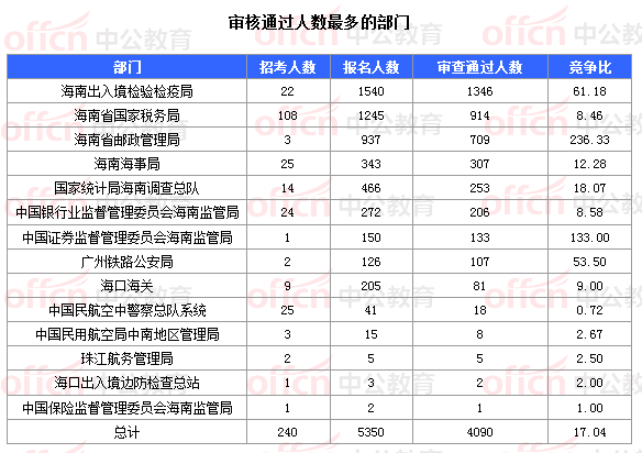 截止到6日16時,通過審核人數(shù)前三位的部門依次是:海南出入境檢驗檢疫局、海南省郵政管理局、海南省國家稅務(wù)局,三部門通過審核總?cè)藬?shù)達(dá)2969人,占通過審核總?cè)藬?shù)的72.59%。