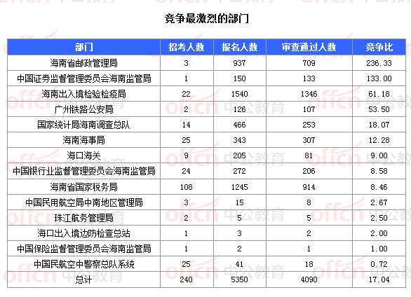 為幫助廣大考生更清晰的了解今日報名情況,中公網(wǎng)校整理了審核通過人數(shù)的部門以及競爭比例最激烈的部門,供廣大考生參考: