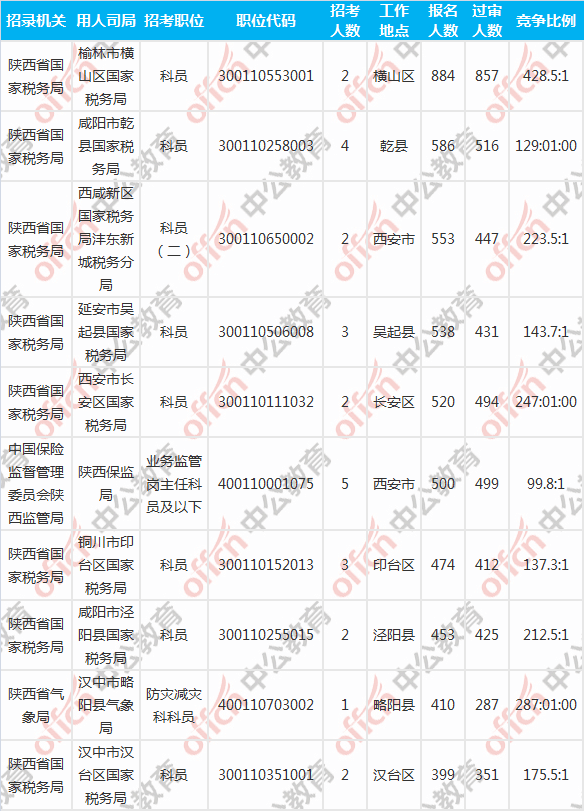 報(bào)名人數(shù)前十的職位主要集中在陜西省國(guó)家稅務(wù)局、中國(guó)保險(xiǎn)監(jiān)督管理委員會(huì)陜西監(jiān)管局、陜西省氣象局等部門,具體信息如下: