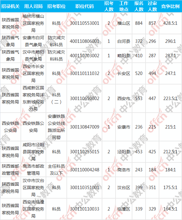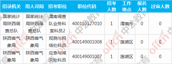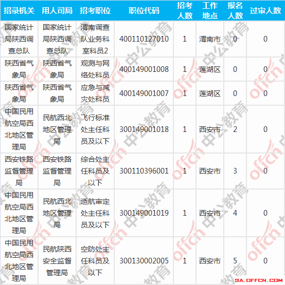 截至到6日16時(shí),工作地點(diǎn)在陜西的,過(guò)審人數(shù)為0的職位共有7個(gè)。下面是過(guò)審人數(shù)為0 的報(bào)考職位一覽表,中公網(wǎng)校專(zhuān)家建議廣大考生再仔細(xì)看看職位表,千萬(wàn)不要錯(cuò)過(guò)了報(bào)名的時(shí)期。建議最晚不要超過(guò)6號(hào)報(bào)名,因?yàn)樵瓌t上資格審查是在報(bào)名后48小時(shí)內(nèi)進(jìn)行,尤其是報(bào)名人數(shù)較多的職位,招考單位審核可能不會(huì)很及時(shí),如果在8日18點(diǎn)之后才發(fā)現(xiàn)未通過(guò)資格審查,那就意味著你失去了這次參與國(guó)考的資格。