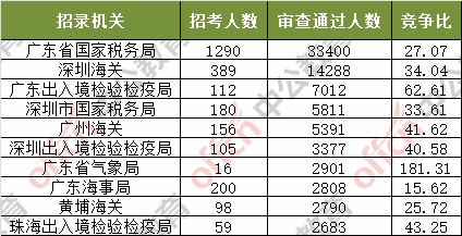 截至11月6日16時,據(jù)中公網(wǎng)校統(tǒng)計,國考職位中工作地點在廣東的職位通過審核總人數(shù)為91224,共有49個職位無人通過審核,平均競爭比例為31.5:1。