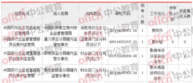 截止到6日16時(shí),工作地點(diǎn)在貴州的職位僅有4個(gè)無人報(bào)考,占全部職位的1.04%。下面是無人報(bào)考職位一覽表,中公網(wǎng)校專家建議廣大考生多關(guān)注一些較冷職位,避免激烈競(jìng)爭(zhēng),結(jié)合自身?xiàng)l件,找到屬于自己的職位。