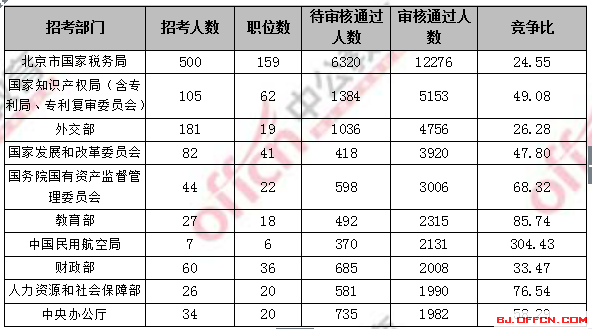 本次國考,北京國稅是北京地區(qū)招錄人數(shù)最多的部門,共招錄500人,目前審核通過的人數(shù)為12276人,待審核人數(shù)為6320,競爭比為25:1,這也能看得出考生對于學生對于國稅的喜愛。在報名最多的10個部門中,由于大部分中央部門都在北京,所以這也是北京整體報考人數(shù)較多的原因。