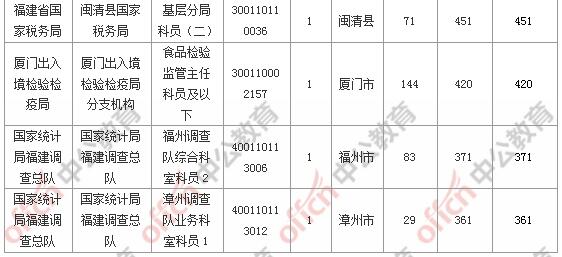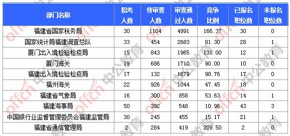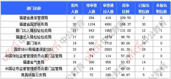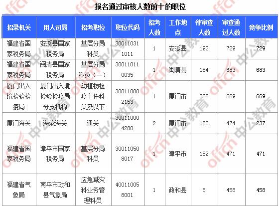 報(bào)名通過(guò)審核人數(shù)前十的職位主要集中在福建省國(guó)家稅務(wù)局、廈門出入境檢驗(yàn)檢疫局、廈門海關(guān),具體信息如下: