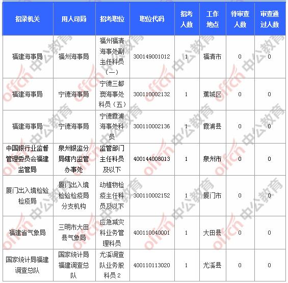 截止到7日9時(shí),工作地點(diǎn)在福建的職位共有7個(gè)無(wú)人報(bào)考,占全部職位的3.16%。下面是無(wú)人報(bào)考職位一覽表,中公網(wǎng)校專家建議廣大考生多關(guān)注一些較冷職位,避免激烈競(jìng)爭(zhēng),結(jié)合自身?xiàng)l件,找到屬于自己的職位。