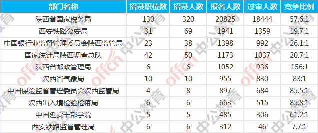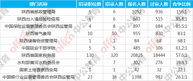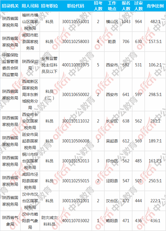 報名人數(shù)前十的職位主要集中在陜西省國家稅務(wù)局、中國保險監(jiān)督管理委員會陜西監(jiān)管局、陜西省氣象局等部門,具體信息如下: