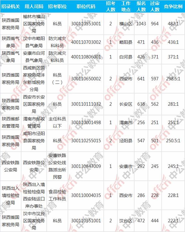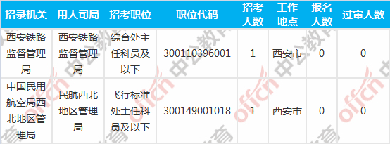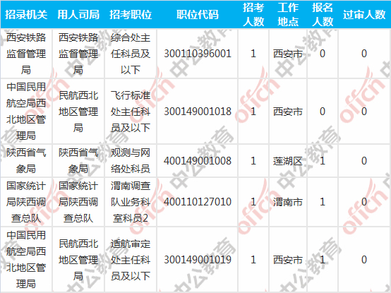 截至到7日9時(shí),工作地點(diǎn)在陜西的,過審人數(shù)為0的職位共有5個(gè)。下面是過審人數(shù)為0 的報(bào)考職位一覽表,中公網(wǎng)校專家建議廣大考生再仔細(xì)看看職位表,千萬不要錯(cuò)過了報(bào)名的時(shí)期。