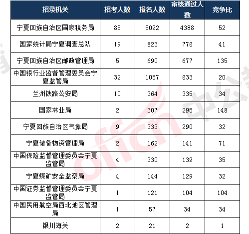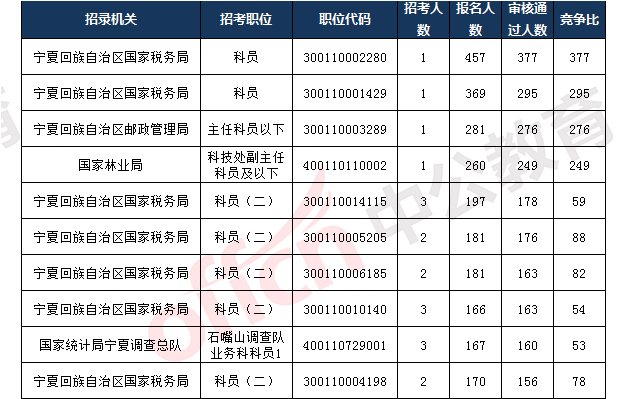 截止到11月7日16時,報(bào)名通過審核人數(shù)前十的職位主要為寧夏回族自治區(qū)國家稅務(wù)局、寧夏回族自治區(qū)郵政管理局,具體信息如下: