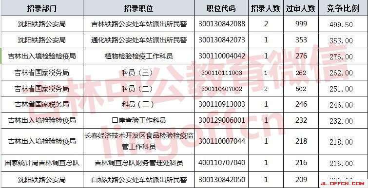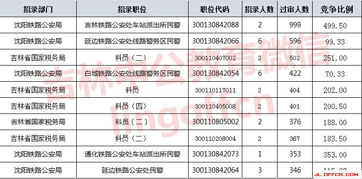 報名通過審核人數(shù)前十的職位主要集中在沈陽鐵路公安局、吉林國家稅務(wù)局等部門,具體信息如下: