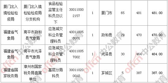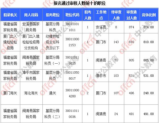 報名通過審核人數(shù)前十的職位主要集中在福建省國家稅務(wù)局、廈門出入境檢驗檢疫局、廈門海關(guān),具體信息如下: