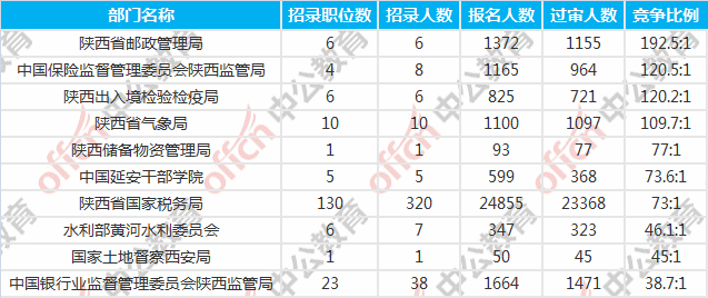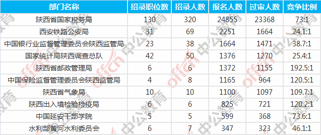 報名人數(shù)前十的職位主要集中在陜西省國家稅務(wù)局、中國保險監(jiān)督管理委員會陜西監(jiān)管局兩大部門,具體信息如下: