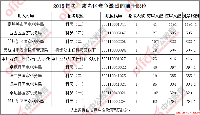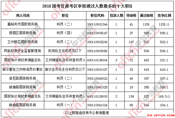 報(bào)名通過審核人數(shù)前十的職位主要集中在嘉峪關(guān)市國(guó)家稅務(wù)局、西固區(qū)國(guó)家稅務(wù)局、蘭州新區(qū)國(guó)家稅務(wù)局,具體信息如下: