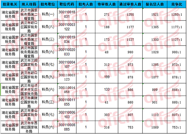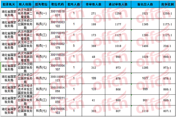 報名通過審核人數(shù)前十的職位集中在湖北省國家稅務(wù)局,具體信息如下:
