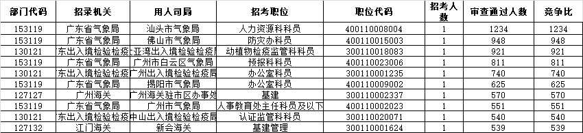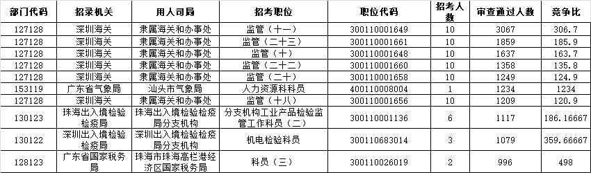 報(bào)名通過審核人數(shù)前十的職位主要集中在深圳海關(guān)、廣東省氣象局、珠海出入境檢驗(yàn)檢疫局等部門,具體信息如下: