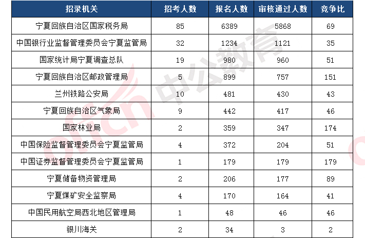 截止到11月8日18時,報名通過審核人數(shù)前十的職位主要為寧夏回族自治區(qū)國家稅務(wù)局、寧夏回族自治區(qū)郵政管理局,具體信息如下: