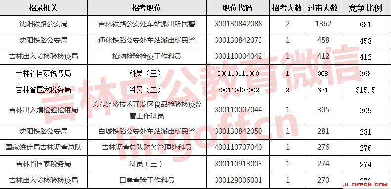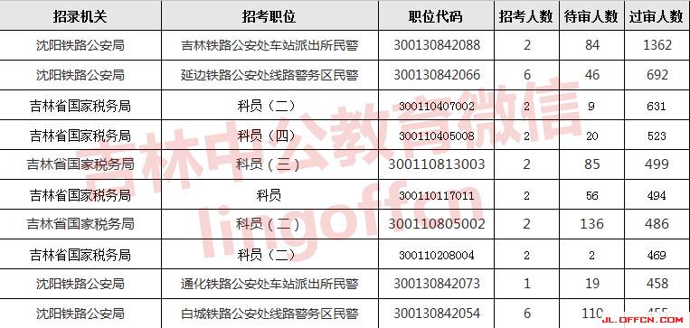 報名通過審核人數(shù)前十的職位主要集中在沈陽鐵路公安局、吉林國家稅務局等部門,具體信息如下:
