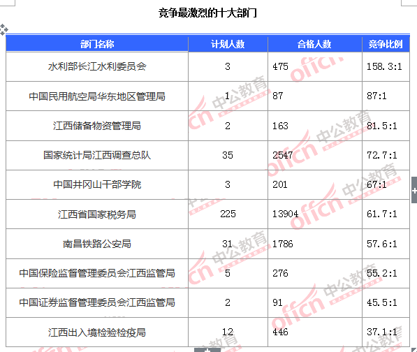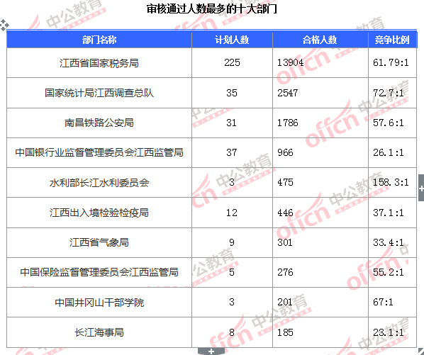 截止到8日17:30時,通過審核人數(shù)前三位的部門依次是:江西省國家稅務局、國家統(tǒng)計局江西調(diào)查總隊、南昌鐵路公安局,三部門通過審核總?cè)藬?shù)達18237人,占通過審核總?cè)藬?shù)的85.3%。