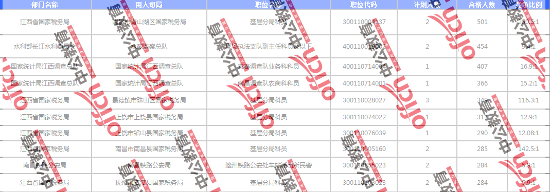 報名通過審核人數(shù)前十的職位主要集中在國家統(tǒng)計局江西調(diào)查總隊 水利部長江水利委員會 國家統(tǒng)計局江西調(diào)查總隊等部門,具體信息如下: