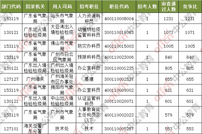 報名通過審核人數(shù)前十的職位主要集中在深圳海關(guān)、廣東省氣象局、珠海出入境檢驗檢疫局等部門,具體信息如下: