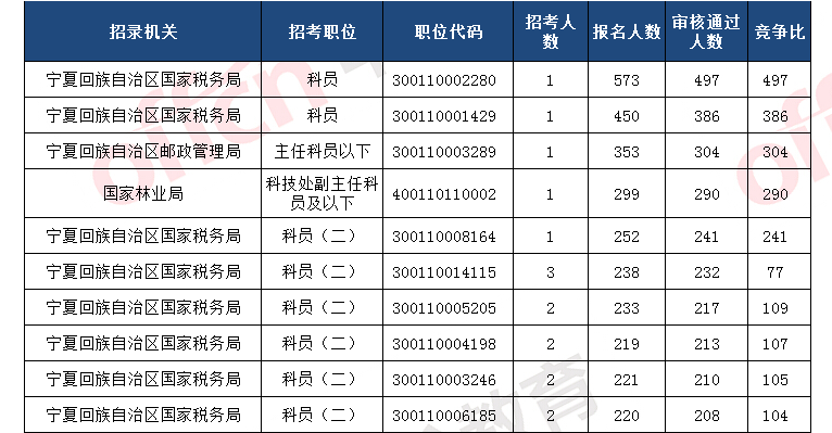 截止到11月8日17時30分,報(bào)名通過審核人數(shù)前十的職位主要為寧夏回族自治區(qū)國家稅務(wù)局、寧夏回族自治區(qū)郵政管理局,具體信息如下: