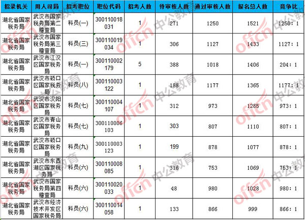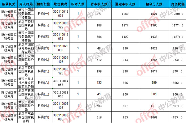 報名通過審核人數前十的職位集中在湖北省國家稅務局,具體信息如下:
