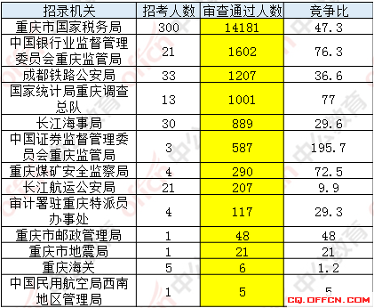 為幫助廣大考生更清晰的了解今日?qǐng)?bào)名情況,重慶中公網(wǎng)校整理了重慶市招錄機(jī)關(guān)的招錄情況,供廣大考生參考: