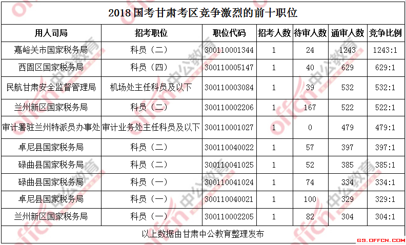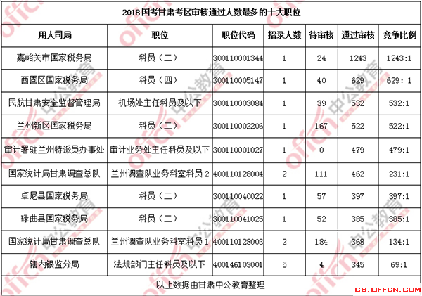 報(bào)名通過審核人數(shù)前十的職位主要集中在嘉峪關(guān)市國(guó)家稅務(wù)局、西固區(qū)國(guó)家稅務(wù)局、民航甘肅安全監(jiān)督管理局,具體信息如下: