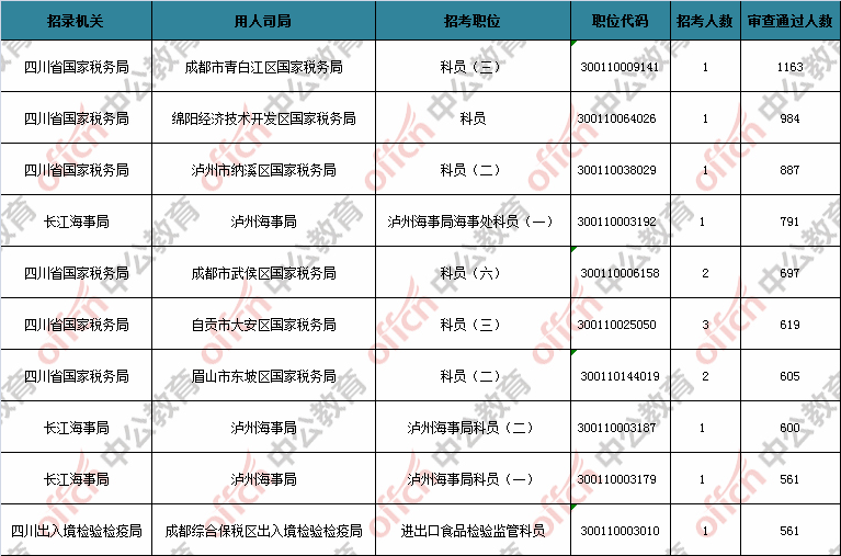截止到8日18:00,競爭比例的職位為“成都市青白江區(qū)國家稅務(wù)局科員(三)”一職,招錄1人,截止到8日18:00通過人數(shù)為1163人。中公網(wǎng)校整理了報名通過審核人數(shù)前十的職位供廣大考生參考: