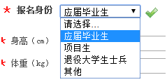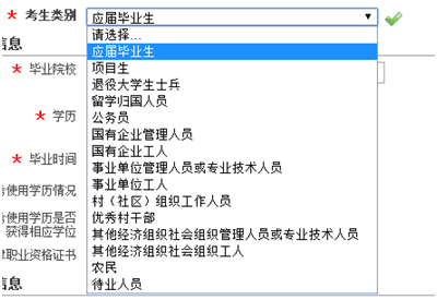 “項(xiàng)目生類別”有5個(gè)選項(xiàng),分別為“無”、“選聘高校畢業(yè)生到村任職”、“三支一扶計(jì)劃”、“大學(xué)生志愿服務(wù)西部計(jì)劃”、“農(nóng)村義務(wù)教育階段教師特設(shè)崗位計(jì)劃”;
