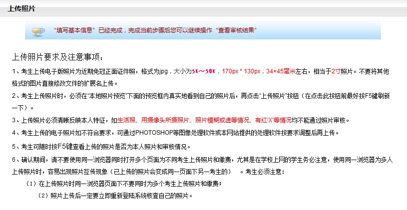 注:考生上傳電子版照片為近期免冠正面證件照,格式為jpg,大小為5K~50K,170px * 130px,34×45毫米左右,相當(dāng)于2寸照片。不要將其他格式的圖片直接修改文件的擴(kuò)展名上傳。