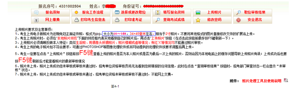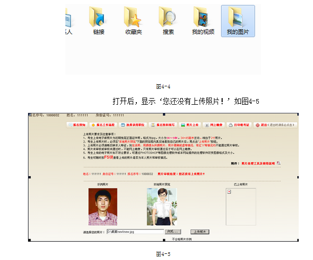 1、點(diǎn)擊‘照片上傳’進(jìn)入照片上傳界面,上傳照片前請?jiān)敿?xì)閱讀‘上傳照片要求及注意事項(xiàng)’如圖4-1。