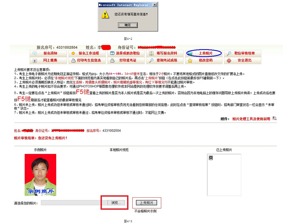 2、如果報名資料沒填寫,點(diǎn)擊‘照片上傳’按鈕就會有圖4-2提示。