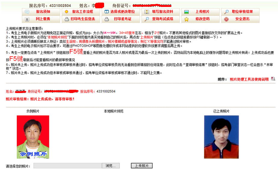 4、點(diǎn)擊‘上傳照片’按鈕,顯示‘已上傳照片,未審核,請等待審核!’如圖4-6,查看照片是否通過,可在圖4-6的頁面進(jìn)行查看。需要注意:每次上傳或更換照片后必按F5鍵刷新,否則有可能在“本地照片預(yù)覽”框內(nèi)看到的是上一次的照片,導(dǎo)致上傳后的并非本人??忌牲c(diǎn)擊“不合格照片示例”按鈕查看不符合要求的照片(僅做示例)。