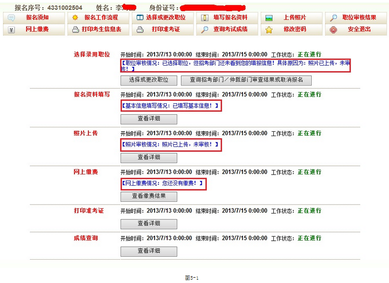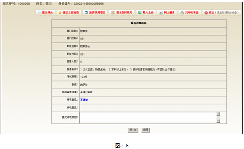 點擊‘報名工作流程’會顯示如圖5-1頁面,點擊該頁面中的‘資格審查結(jié)果’會查看到是否通過審查,審核通過可以進(jìn)行繳費(fèi)操作,審核未通過可以取消報名或提交仲裁,未審核時請等待審核。