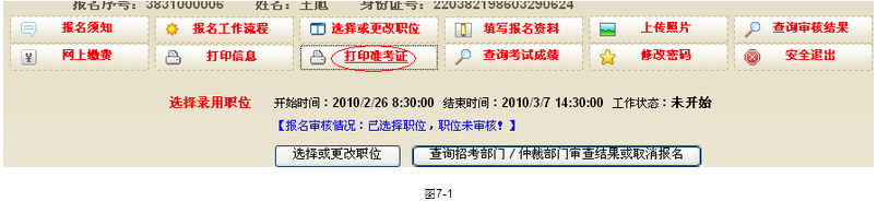 2、打印準(zhǔn)考證的時間在‘報名工作流程’下的‘打印準(zhǔn)考證’位置查看,如圖7-1
