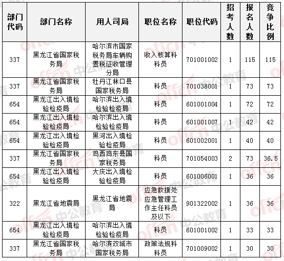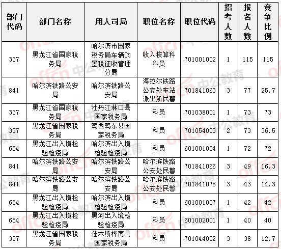 截至17日18時(shí),招錄比例的職位為黑龍江省國(guó)家稅務(wù)局哈爾濱市國(guó)家稅務(wù)局車輛購(gòu)置稅征收管理分局收入核算科科員一職,招錄1人,通過(guò)人數(shù)為115人,競(jìng)爭(zhēng)比例達(dá)到115:1,具體信息如下: