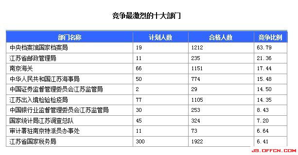 截至18日8時,招錄比例的職位為中央檔案館國家檔案局中國第二歷史檔案館利用處主任科員及以下職務,招錄1人,通過審核人數(shù)為404人,報名通過審核人數(shù)前十的職位主要集中在中央檔案館國家檔案局、中華人民共和國江蘇海事局、南京海關(guān)、江蘇出入境檢驗檢疫局等部門,具體信息如下:
