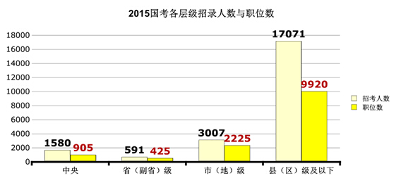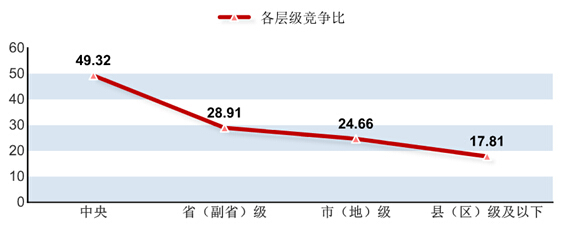 中央、省、市、縣四級(jí)目前競(jìng)爭(zhēng)比是逐漸下降的,中央競(jìng)爭(zhēng)比,為49.32:1,接近50人爭(zhēng)一個(gè)職位,縣(區(qū))級(jí)及以下最低,僅為17.81:1。中公教育專(zhuān)家分析,考生都偏愛(ài)中央層級(jí)的職位,都想進(jìn)入“高層”。 9月25日,人社部聯(lián)合多個(gè)部委正式公布了《關(guān)于做好艱苦邊遠(yuǎn)地區(qū)基層公務(wù)員考試錄用工作的意見(jiàn)》,從六個(gè)方面明確了降低了邊遠(yuǎn)地區(qū)公務(wù)員的進(jìn)入門(mén)檻,且基層公務(wù)員工資改革在即,基層職位的發(fā)展前景廣闊。而在2015國(guó)考公告中也明確指出:對(duì)西部地區(qū)和艱苦邊遠(yuǎn)地區(qū)職位、基層職位和特殊專(zhuān)業(yè)職位等,在劃定最低合格分?jǐn)?shù)線時(shí)將予以政策傾斜。中公教育專(zhuān)家建議考生可將眼光放長(zhǎng)遠(yuǎn),多關(guān)注西部邊遠(yuǎn)地區(qū)職位,積極響應(yīng)國(guó)家的優(yōu)待政策,下基層去鍛煉自己,為將來(lái)的宏圖偉業(yè)奠定基石!