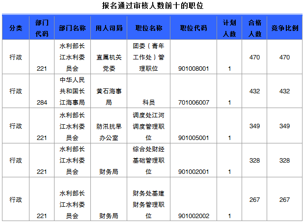 報(bào)名通過(guò)審核人數(shù)前十的職位主要集中在水利部長(zhǎng)江水利委員會(huì)、中華人民共和國(guó)長(zhǎng)江海事局黃石海事局等部門,具體信息如下:
