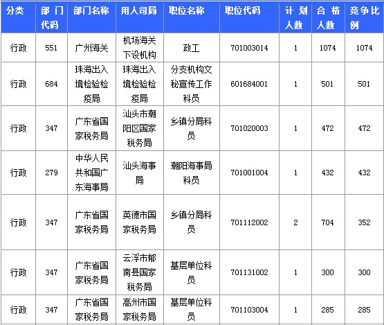 截至21日16時(shí),招錄比例的職位為廣州海關(guān)政工一職,招錄1人,通過(guò)人數(shù)為1074人,報(bào)名通過(guò)審核人數(shù)前十的職位主要集中在廣州海關(guān)、深圳出入境邊防檢查總站、深圳海關(guān)等部門,具體信息如下: