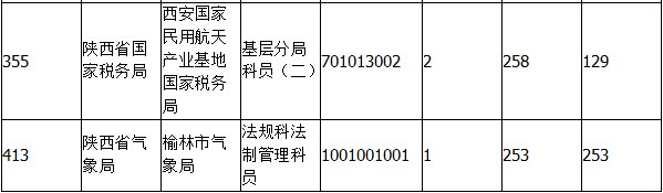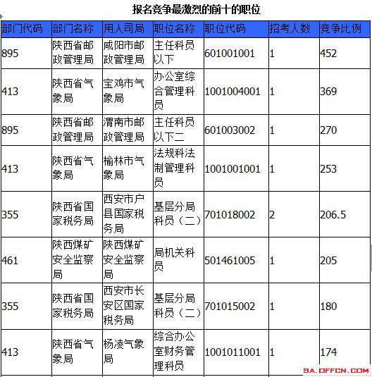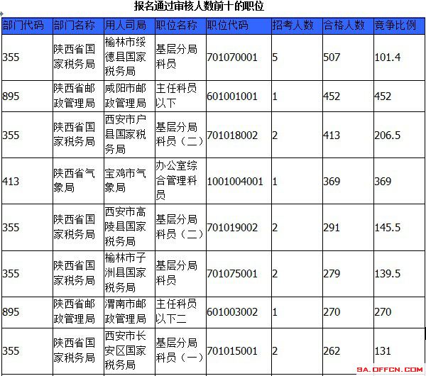 報名通過審核人數(shù)前十的職位主要集中在陜西省郵政管理局、陜西省氣象局、陜西省國家稅務局等部門,具體信息如下: