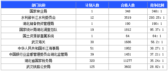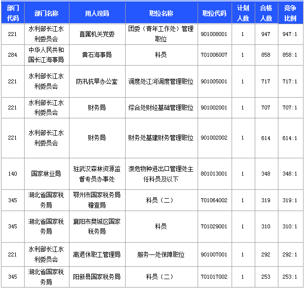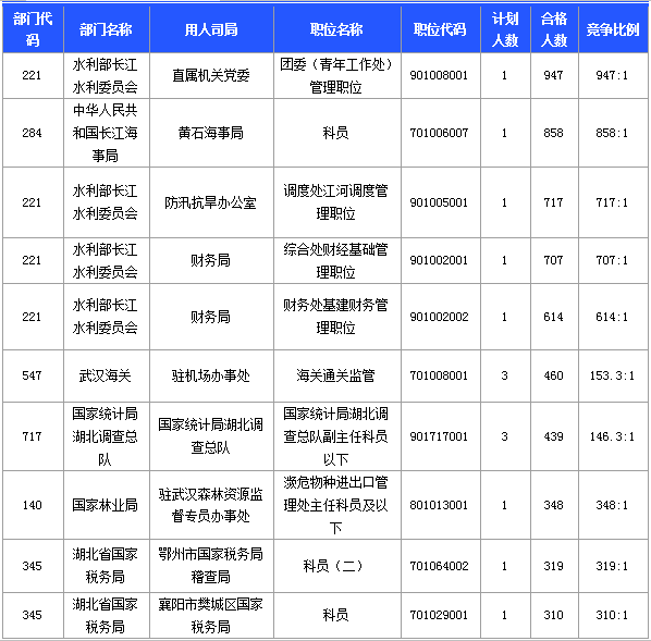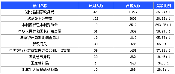 報(bào)名通過審核人數(shù)前十的職位主要集中在湖北省國家稅務(wù)局、水利部長江水利委員會(huì)等 部門,具體信息如下: