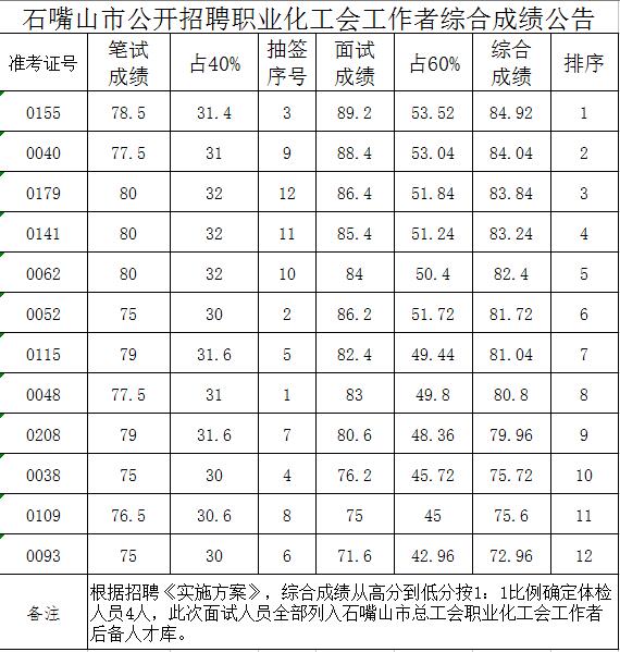 2015寧夏石嘴山市職業(yè)化工會(huì)工作者招聘綜合成績(jī)公告