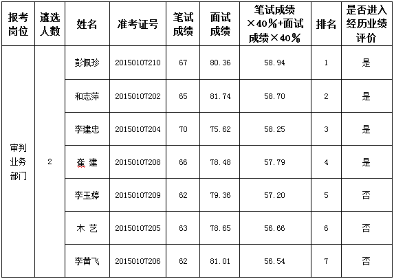 根據(jù)《怒江州2015年州級機(jī)關(guān)公開遴選公務(wù)員和參照公務(wù)員法管理單位工作人員公告》要求,面試由遴選單位負(fù)責(zé)實(shí)施,現(xiàn)將怒江州中級人民法院公開遴選公務(wù)員面試成績及進(jìn)入業(yè)績評價(jià)人員名單公告如下: