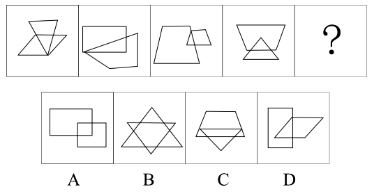 (答案:D。題干中前四個圖呈現(xiàn)出的規(guī)律是:公共部分是三角形。依據(jù)這一規(guī)律,正確答案應(yīng)為D。)