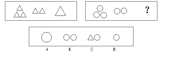 解析:答案為A。第一套圖形是三角形由三個(gè)遞減為一個(gè),第二套圖形是圓形由三個(gè)減為兩個(gè),最后一個(gè)是要填的圖形。很顯然,這兩套圖形排列的共同規(guī)律是圖形每下一個(gè)遞減一個(gè)。所以問號(hào)處應(yīng)填上一個(gè)圓。選項(xiàng)中A和D都是圓,那么究竟該選哪一個(gè)呢?再看第一套圖形,最后一個(gè)三角形明顯比前面的三角形大。所以問號(hào)處也應(yīng)是一個(gè)大圓。實(shí)際上這道題的排列用了兩種規(guī)律,若粗心大意,往往會(huì)認(rèn)為D是正確答案,而漏掉了真正的正確答案A。