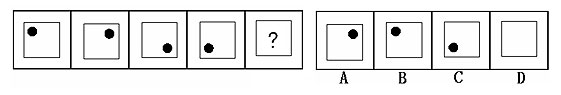 (答案:B。黑點(diǎn)在正方形中順時(shí)針移動(dòng)。在第5個(gè)圖形中,應(yīng)該正好移動(dòng)到左上角。)