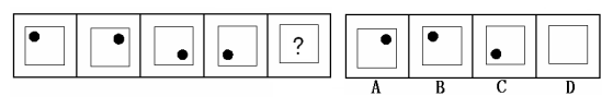 (答案:B。黑點在正方形中順時針移動。在第5個圖形中,應(yīng)該正好移動到左上角。)