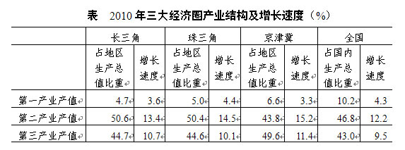 三大經(jīng)濟圈中,2010年三次產(chǎn)業(yè)增長速度均超過全國平均水平的有幾個?