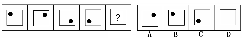 (答案:B。黑點(diǎn)在正方形中順時(shí)針移動(dòng)。在第5個(gè)圖形中,應(yīng)該正好移動(dòng)到左上角。)